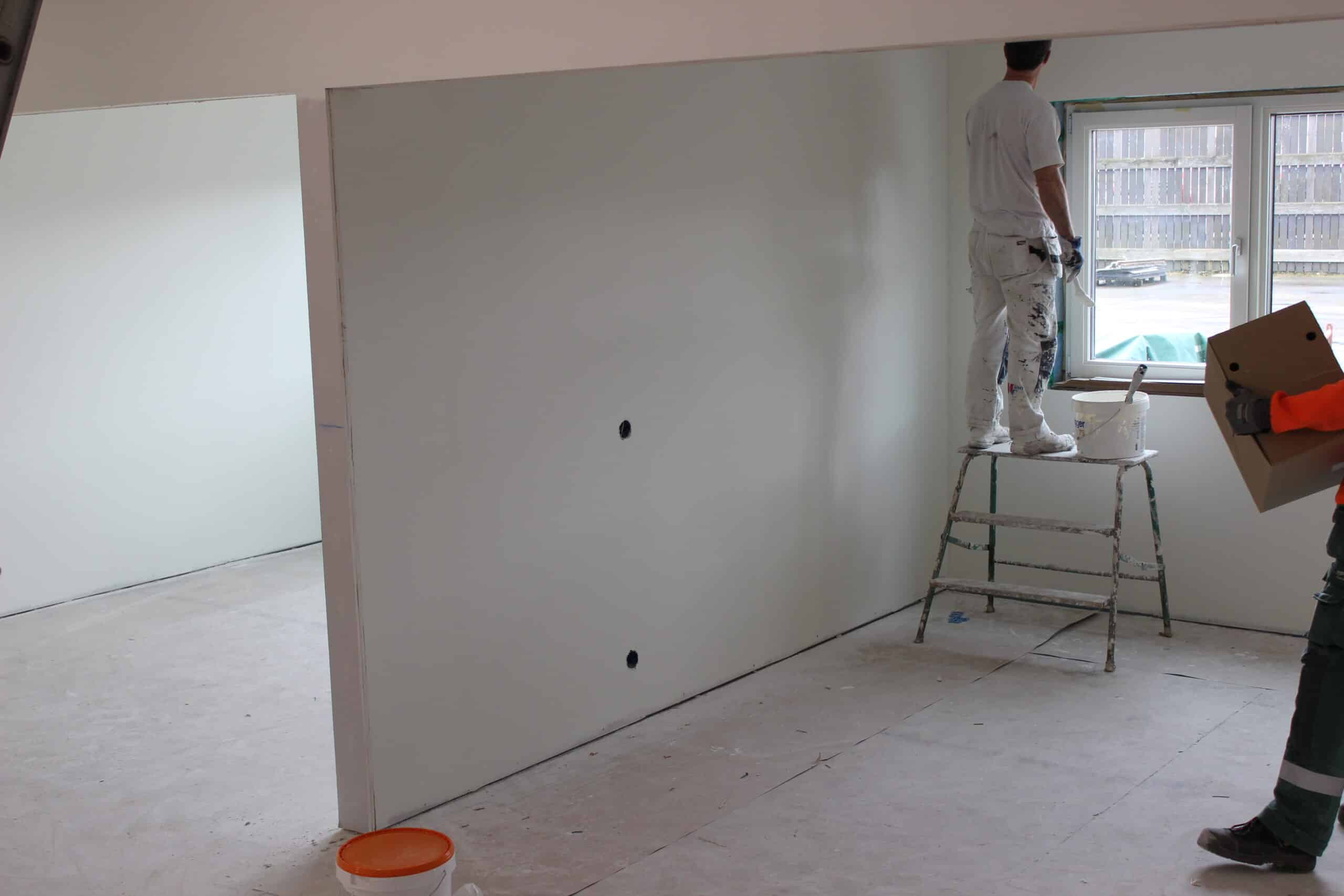 Målarna är glada. Äntligen har fönster kommit på plats och de får känna vårsolen som strålar in.