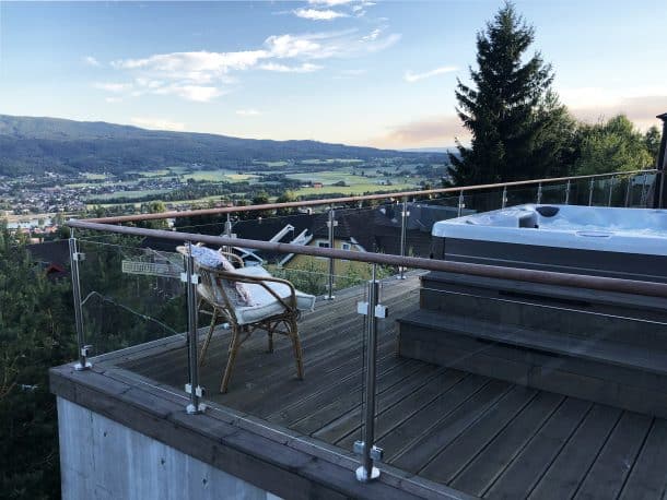Med den här utsikten känns ett glasräcke självklart! Den här norska kunden valde ett rostfritt räcke med en överliggare i jatoba. Tummen upp!