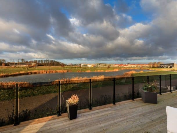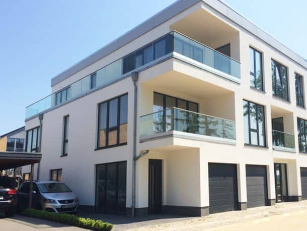 Ett flerfamiljshus där man valt ett stolpfritt glasräcke vilket skapar en exklusiv känsla och en rymd till balkongen. Tjusigt!