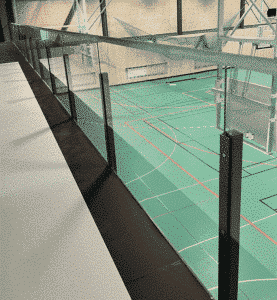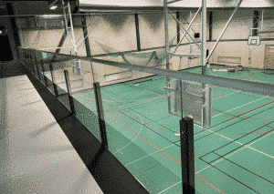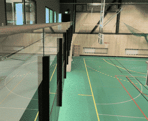 Projektinformation: Vårt Alu-Modern räcke i en idrottshall i Hjärnarp.
