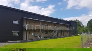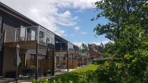 Två identiska hus med aluminiumräcke som är monterat utanpå. I detta projekt sålde vi även trappräcken.